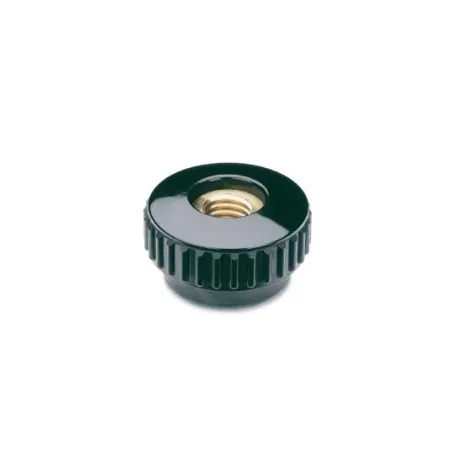 Manípulo de aperto em baquelite rosca fêmea passante, inserto em latão, cor preta, acabamento polido. Fonte de imagens e desenhos técnicos: Elesa+Ganter.