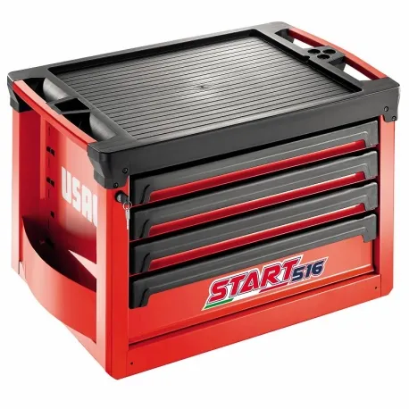 Estrutura e gavetas em chapa de aço com pintura epóxi, cor vermelha RAL 3020