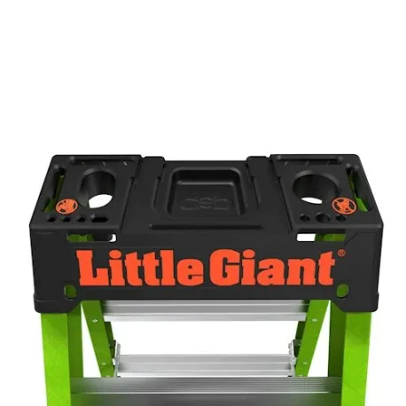 Quatro portas nas laterais e na parte traseira da tampa superior aceitam acessórios Little Giant compatíveis, como Loot Box™ ou Strap Holder™. Adicione alguns porta-brocas, coldres para furadeiras e fitas métricas, travas de fricção para latas de galão e litro e uma bandeja de fixação magnética, e você terá um cinto de ferramentas completo no topo de sua escada.