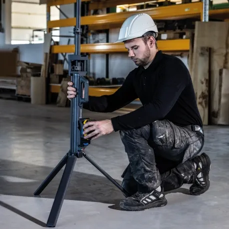O TOWER 5 CONNECT possui um sistema QUICK-FOLD, tornando rápido configurar o tripé em apenas alguns segundos e dobrar novamente quando o trabalho estiver concluído. Na posição dobrada, é compacto e projetado para transporte com uma mão com a alça de transporte integrada. O design robusto e fino e o baixo peso de apenas 5,2 kg o tornam adequado para transportar na parte de trás do carro e conveniente para transportar de um trabalho para outro.