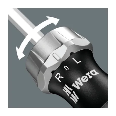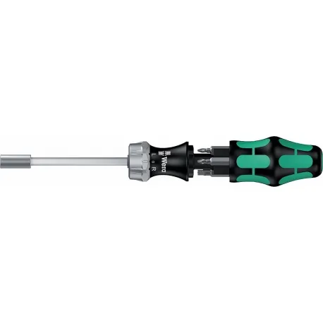 Ferramenta compacta Wera com cabo Kraftform multicomponente para altas velocidades de trabalho e aparafusamento particularmente ergonômico. Magazine de bits integrado no cabo. Inclui catraca: passo fino para ângulo de retorno pequeno, anel de comutação (direito, fixo, esquerdo), torque máximo de até 50 Nm; lâmina hexagonal com tomada hexagonal de ¼", luva inoxidável, forte ímã permanente.
