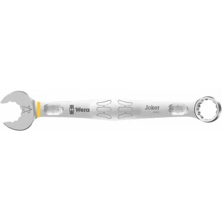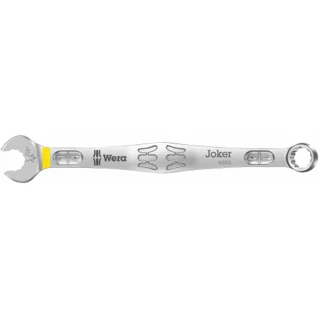 Como o espaço de instalação se torna cada vez mais apertado durante o aparafusamento, são necessárias ferramentas que permitam aos usuários trabalhar com sucesso mesmo em tais situações. Espaços estreitos requerem pontos de posicionamento adicionais da ferramenta. As chaves podem ser modificadas para que as possibilidades de posicionamento da ferramenta aumentem? A combinação da boca articulada de 7,5° e a geometria hexagonal dupla duplica os pontos de colocação. Uma volta repetida de 180° da chave em torno do eixo longitudinal durante o aparafusamento fornece quatro possibilidades de colocação, e parafusos ou cabeças de parafusos podem ser encaixados a cada 15°. O Joker 6003 com sua geometria de boca inteligente expande significativamente a gama de usos em espaços confinados. O Joker 6003 encontrará automaticamente o respectivo ponto de posicionamento após cada curva. O lado estreito e robusto do anel tem um ângulo de 15° em relação ao eixo da ferramenta. O tratamento de superfície de alta qualidade proporciona uma proteção anticorrosiva alta e duradoura. Com localizador de ferramentas "Take it easy": codificação de cores por tamanho.