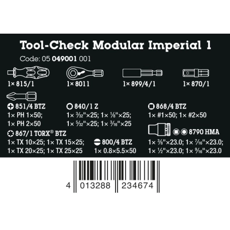 Tool-Check Modular Imperial 1, 21 peçasFerramenta-Check Modular Imperial 1CompactarO sistema modular Tool-CheckChave de fenda para bits sextavados de 1/4"Parafusamento com catraca de brocaO suporte de bits 899/4/1O conector 870/1Bits com localizador de ferramentas Take it easy