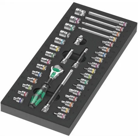 Inserção de espuma durável; bicolor para identificação rápida de peças faltantes; adequado para o armário de rolos Tool Rebel, equipado com uma catraca Wera Zyklop Speed ¼" e um conjunto de acessórios de 36 peças. Catraca de velocidade Zyklop 8000 A com acionamento de 1/4"