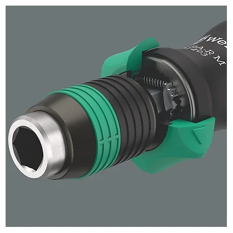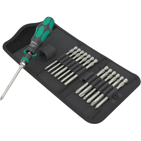 O mandril de liberação rápida Rapidaptor permite trocas de bits extremamente rápidas sem ferramentas extras. O forte ímã permanente segura os bits firmemente. 13 bits resistentes para uso universal (Phillips-head Phillips e Pozidriv, TORX®, soquete ranhurado e sextavado), 89 mm de comprimento; niquelado quimicamente.