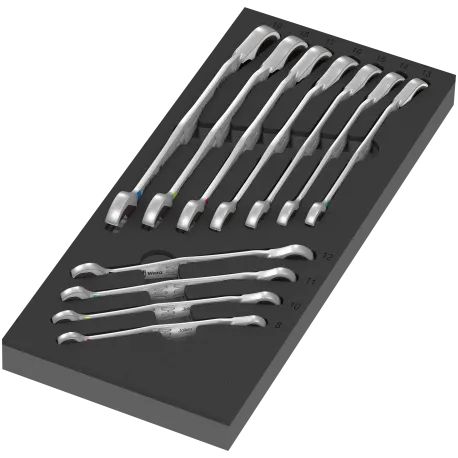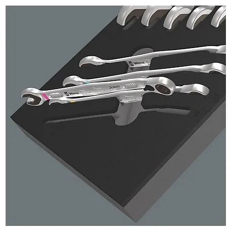 Inserção de espuma durável; bicolor para rápida identificação de peças faltantes; adequado para o gabinete de rolos Tool Rebel. Equipado com 11 chaves de catraca de anel reversíveis Joker Switch 6001.