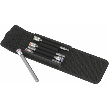 Conjunto de soquete de bits, soquete sextavado, com função de retenção para uma aparafusamento particularmente conveniente com risco reduzido de perder o parafuso ao endereçar a peça de trabalho. Tamanho: 1x4x100mm | 1x5x100mm | 1x6x100mm | 1x7x100mm | 1x8x100mm
