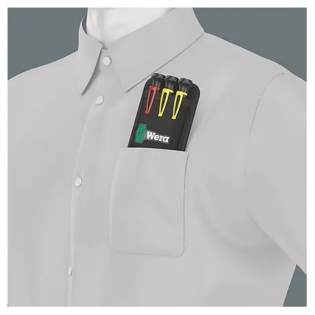 Conjunto de micro chave de fenda Wera para fixações finas. Ao apoiar a mão na tampa giratória e através da zona de rotação rápida abaixo da tampa giratória, é possível girar rapidamente. A necessidade de manobras demoradas é eliminada. Armazenamento e transporte em uma bolsa resistente, para que a ferramenta esteja sempre à mão. Inclui 3 mestres-chave de fenda em uma bolsa, que pode ser facilmente colocada no bolso do peito e assim estar sempre à mão. Com o localizador de ferramentas Take it easy: marcação de cores por perfil e carimbo de tamanho.